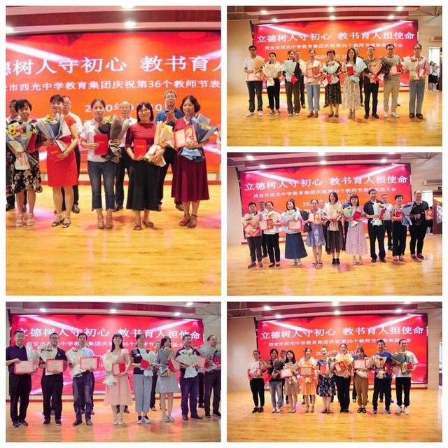 秋风送爽,丹桂飘香。在这美丽的季节,我们迎来了第36个教师节。续写奋进之笔,守护教育初心,2020年9月10日下午,西安市西光中学教育集团隆重举行庆祝第36个教师节表彰奖励大会。对一年来,在教育教学工作岗位上涌现出的优秀共产党员、优秀教师、优秀班主任、优秀组长、优秀教辅人员予以表彰。同时,对在2020年新冠肺炎疫情期间,不畏艰辛,面对疫情,迎难而上,凝神聚力,精诚团结,努力拼搏,取得骄人成绩的2020届高、初三教师予以表彰奖励。