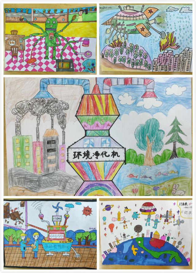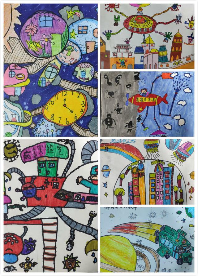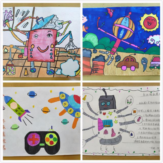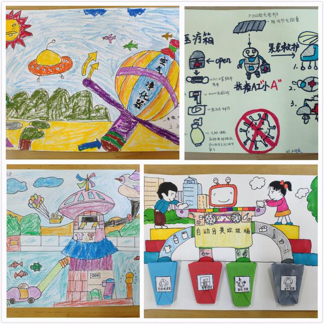 有热气球改装成的空气净化器,抗疫机器人小A,自动分类的垃圾分类机,无限干冰灭火器、会飞的公交车、净化空气的雾霾清洗机……孩子们的创意绘画作品,琳琅满目,充满想象与童趣。