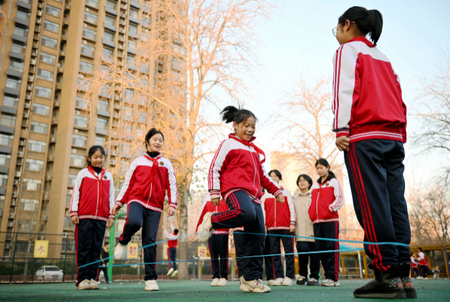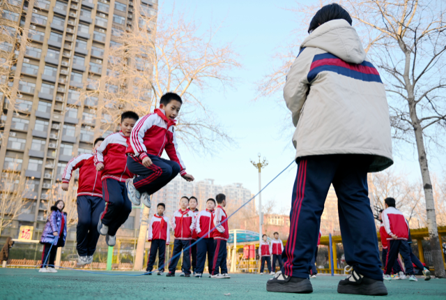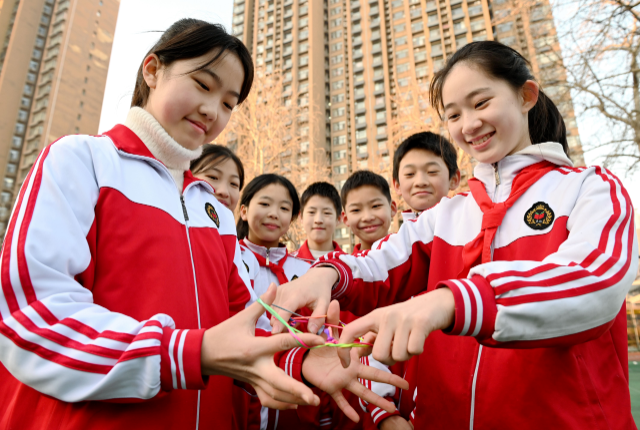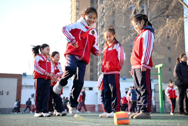 12月26日,河北省邯郸市丛台区永和学校的学生在课间进行“翻彩绳”“编花篮”“跳房子”等丰富多彩的传统游戏活动,为校园生活增添了活力。今年,该校将内容丰富、形式多样的传统游戏引入课间活动,让学生们不仅锻炼了身体协调能力,也增强了团队协作能力,还营造了健康向上的校园文化氛围。