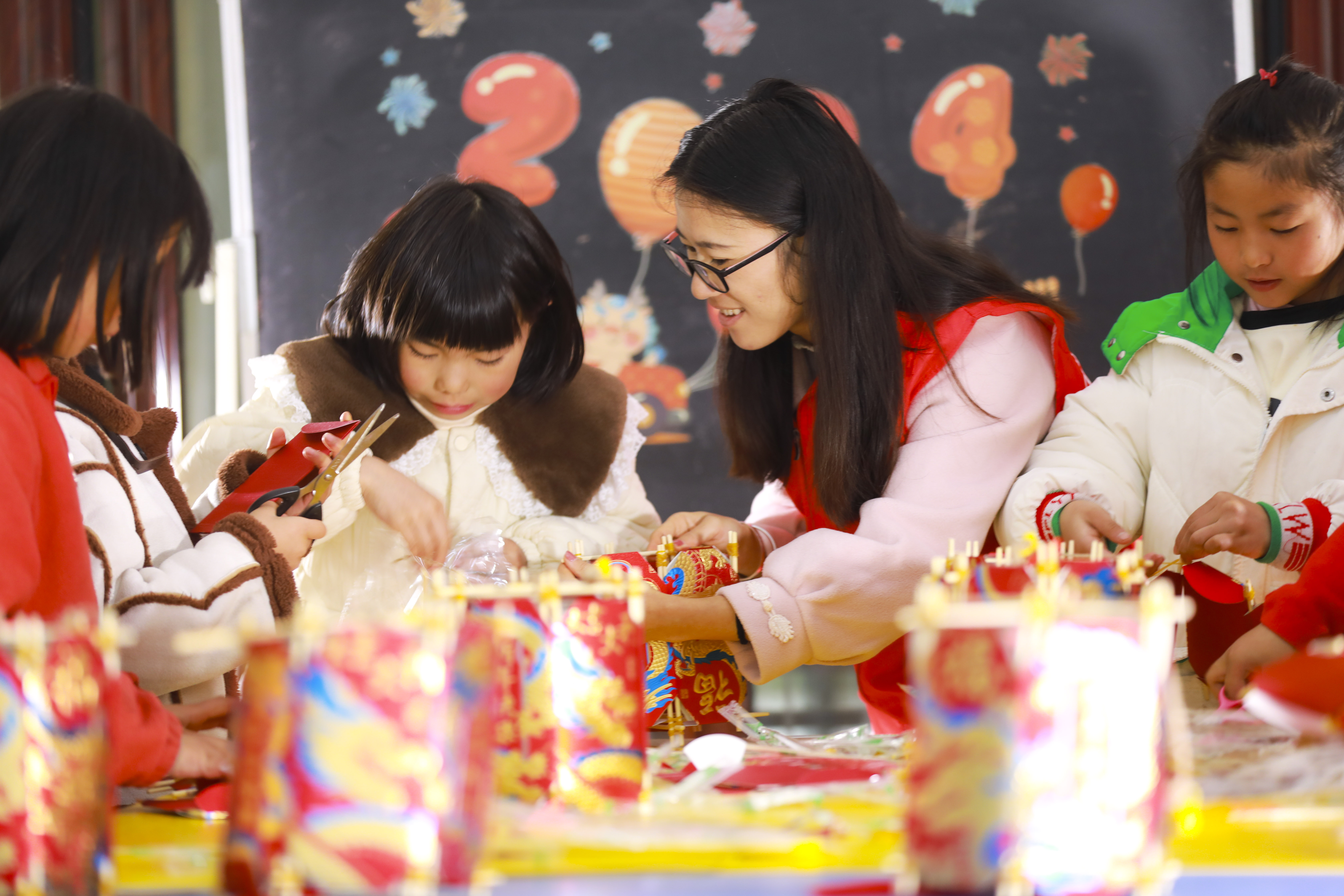 2023年12月30日,贵州省黔西市文峰街道塔山社区新时代文明实践站里,青年志愿者带领孩子们做花灯迎新年。通讯员 周训超 摄