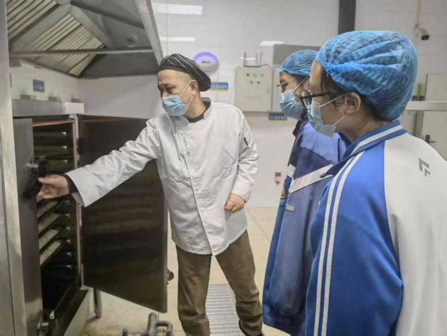 进入后厨前,学生代表严格遵循食品安全规范,佩戴口罩、头套,确保自身卫生达标。在食堂负责人的引导下,他们重点围绕食材品质、卫生环境、操作规范、餐具清洁等关键环节,展开细致排查,依次参观食材储存区、制作区、冷冻区,通过实地查看与询问,全面了解食堂的整体运营情况。