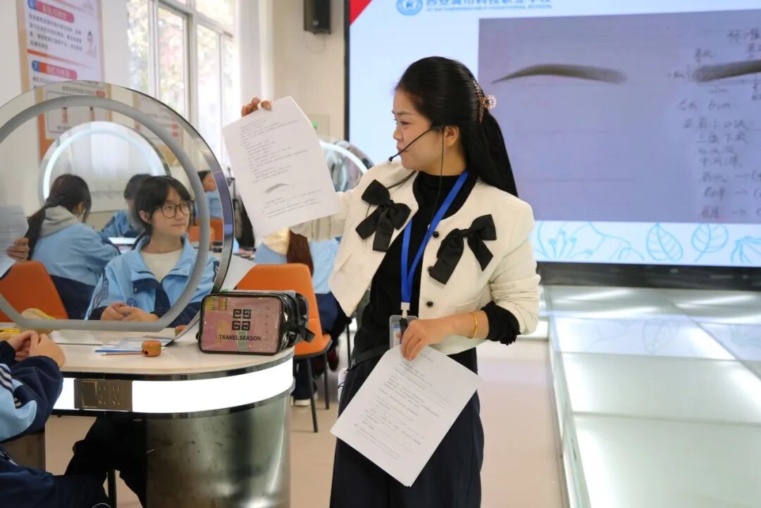 当日上午,代表团走进形象设计实训中心,参加这场别开生面的文化+专业的创新课。这堂课由曹彤老师主导专业教学、成萌老师主导英语学习,双师配合默契。课程开篇,成萌老师通过展示不同眉形的对比图,引入单词讲解,通过“师生问答”场景,学习英语句式,例如,如何为不同脸型选择合适眉形?英语句式“How to choose the right eyebrow shape for different face shapes?”等实用句型,让学生在专业场景中轻松掌握英语表达。随后,曹彤老师进行专业课教学,采用“三步教学法”:第一步:“实物拆解示范”,第二步:“问题导向指导”,第三步:“分层实操训练”,她将学生按基础分为“入门组”和“提升组”,对入门组重点指导握笔姿势,对提升组则要求尝试“渐变眉色”技法,而成萌老师则在旁巡回,用英语提问“Which step are you on now?(你现在进行到哪一步?)”,引导学生用英语描述操作过程,实现专业技能与英语应用的同步提升。