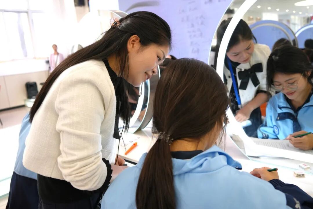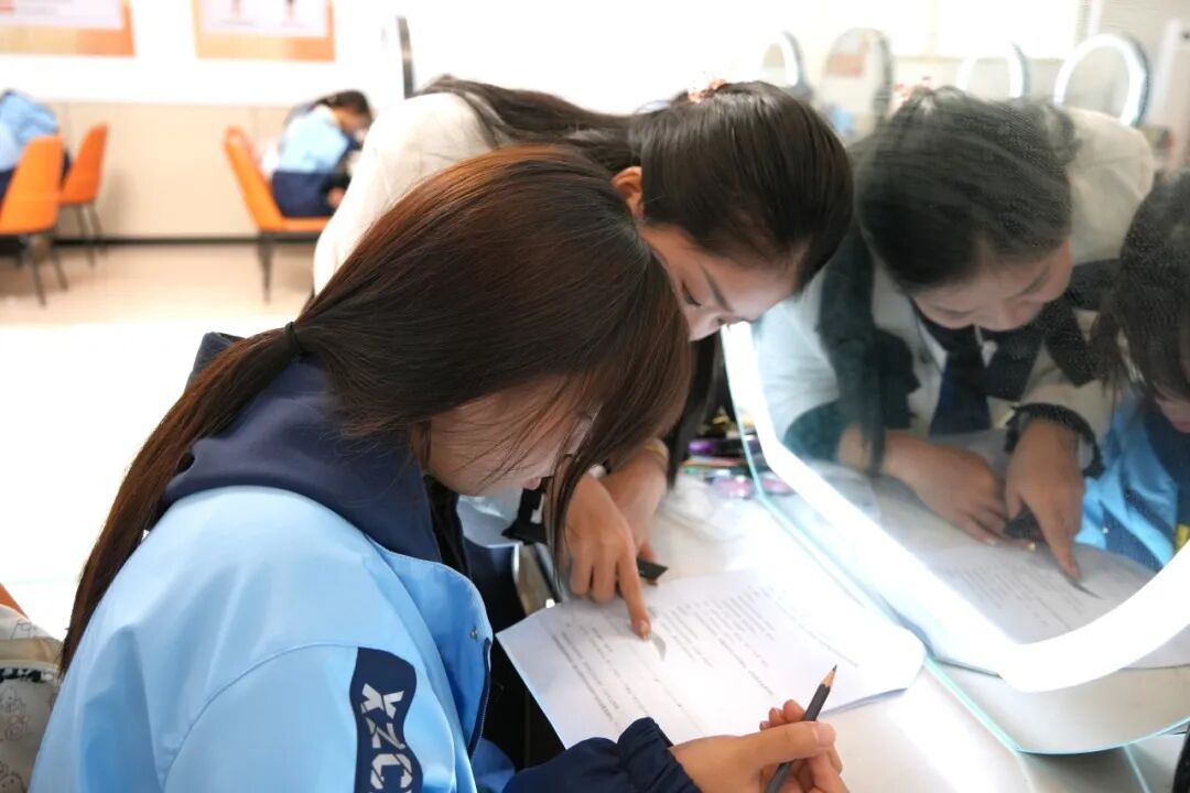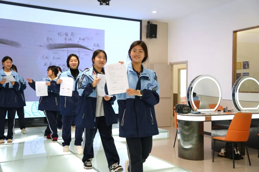 代表团成员纷纷拿出手机记录教学细节,长子县职业技术学校的老师感慨:“双师协作既保证了专业教学的深度,又让英语学习不脱节,这种‘做中学、学中用’的模式,真正打通了普职融通的课程堵点。”整堂课中,学生们热情高涨,积极参与互动,不仅熟练掌握了画眉专业技能,还能流畅运用英语表达专业内容。“这种课程太有意思了,学专业的同时还能练英语,一点都不觉得累!” 学生们的反馈充满对课程的认可。