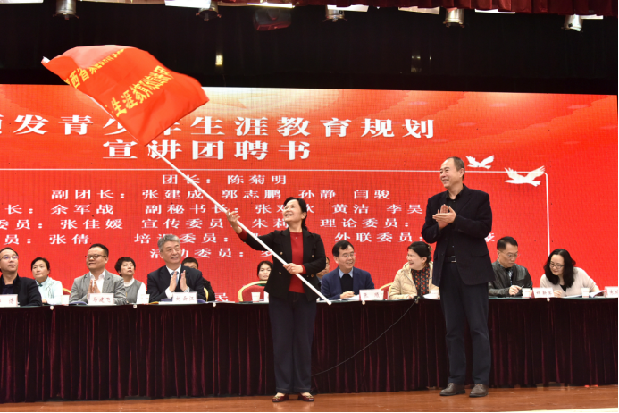 本次会议根据社会各界的强烈呼吁,广大家庭对生涯教育的紧迫需要,成立了青少年生涯教育宣讲团,杨辽主任为宣讲团团长陈菊明、副团长张建成、郭志鹏、孙静、闫骏授旗,并为宣讲团讲师颁发了聘书。陈菊明表示,宣讲团将助力青少年精准确定未来发展目标、明晰生涯规划方向,帮助广大家庭夯实育人基础、破解子女成长难题、实现美好育人愿望。