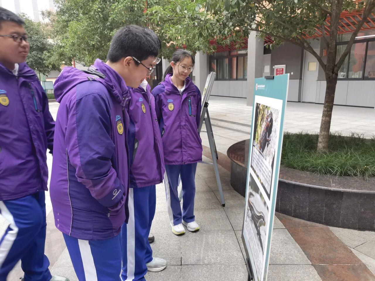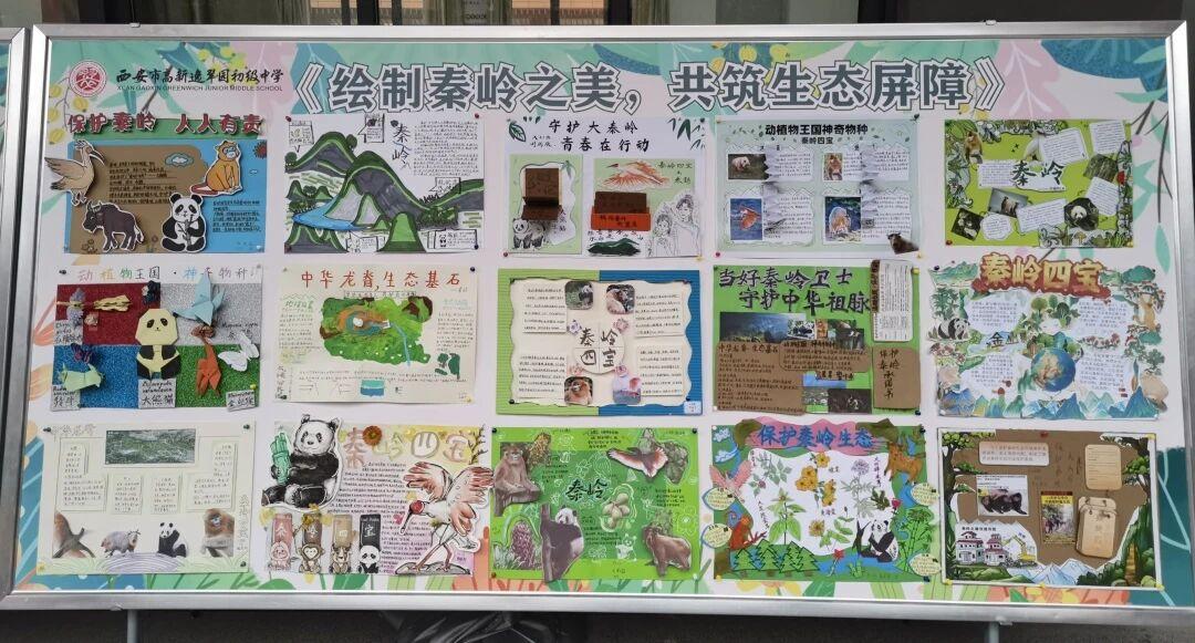 校园日晷广场化身一座微型的“秦岭生态博览馆”,师生共同打造的创意展板成为校园里的“生态课堂”。学生们亲手绘制的立体宣传小报,生动阐释了秦岭作为“中华龙脊”“中央水塔”的战略意义,图文并茂地展现了“秦岭四宝”的灵动姿态,也通过“警示录”板块揭示生态破坏现状,结合法规解读,全景呈现了秦岭的生态价值与保护紧迫性。