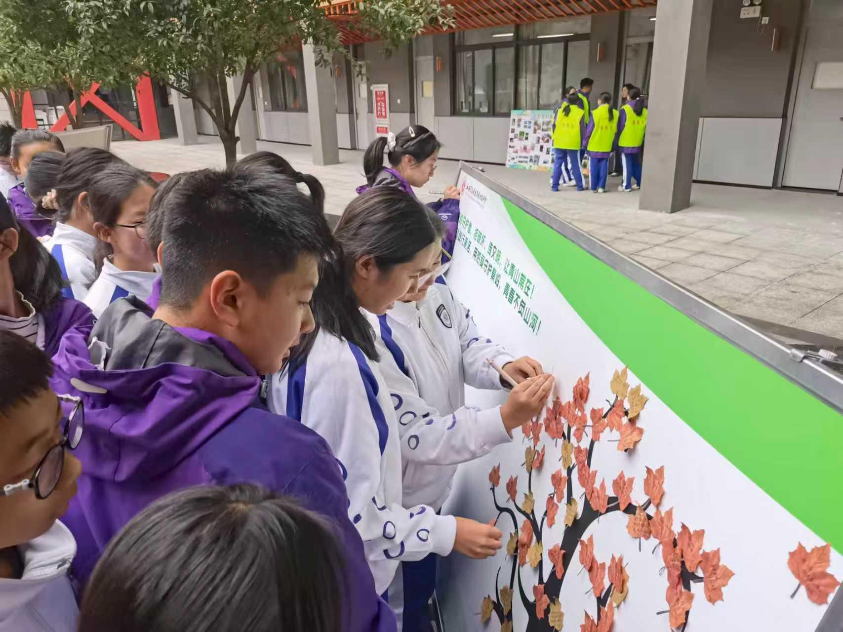 “我的校园我守护” 绿色标语牌创意设计活动,则将环保视角延伸至校园日常。同学们发挥创意,创作了一批或温馨、或诗意、或诙谐的标语 ,配以精心设计的图案,将爱护校园环境的心意凝聚其中。这些优秀设计即将被制作成实物标牌,悬挂于校园的草木之间,成为一道恒久的文明风景。在“我为秦岭添抹绿” 环保承诺树上,学生们在“绿叶”上写下“每周少用一个塑料袋”“参与垃圾分类”等承诺,让象征生命与希望的“大树”变得枝繁叶茂。