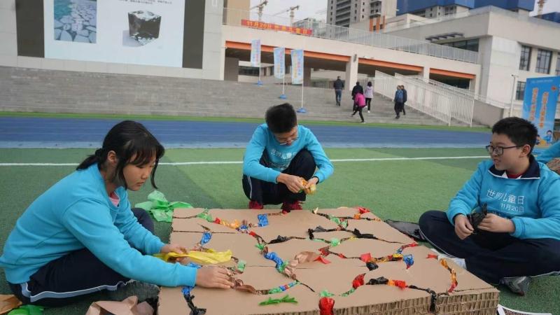 这是西安市妇联、西安市发展和改革委员会联合西安建筑科技大学志愿者及社会公益组织艺术家,为响应联合国儿童基金会2025年世界儿童日“敢作气候担当,点亮儿童未来”倡议,开展的“绿脉共生”创意点亮活动现场。西安市儿童友好观察团和经开第五学校生态社团的孩子们,在大学生志愿者和艺术家的带领下,将日常生活中的纸壳、塑料瓶、旧布料等可回收物品,变废为宝。