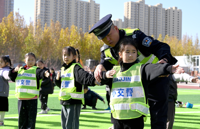 民警指导学生学习交通指挥手势。通讯员 郝群英 摄