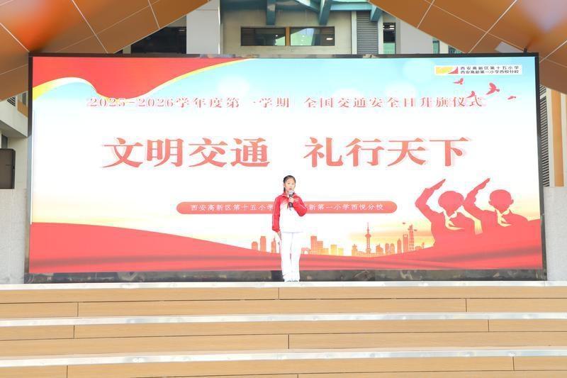12月1日上午,西安高新区第十五小学全体师生齐聚操场,举行“文明交通 礼行天下”主题升旗仪式。值周中队、二年级五班钱曦玥同学作为学生代表,发表国旗下主题讲话。她紧扣“文明交通 你我同行”主题,用通俗易懂的语言阐述遵守交通法规的重要性,并呼吁全体同学:认真学习交通法规,增强安全意识,争做文明交通的践行者、宣传者和监督者,共同守护生命安全线。