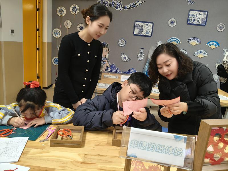 美术教室内,剪纸、绘画等传统文化体验活动让香港学生亲手感受中华艺术的魅力,孩子们在老师指导下完成作品,收获满满。最后的冰壶体验环节更将气氛推向高潮,两地学子并肩协作,在欢声笑语中体验运动的乐趣。两校还互赠了礼物,未央路小学赠予香港基全小学剪纸作品《大美长安》,寓意两地情谊如剪纸般细腻绵长。“西安的小朋友很友好,表演非常精彩,校园生活很丰富,瓦当拓印和漆扇画都很有趣,让我感受到了中华优秀传统文化的魅力。”香港小学生说。