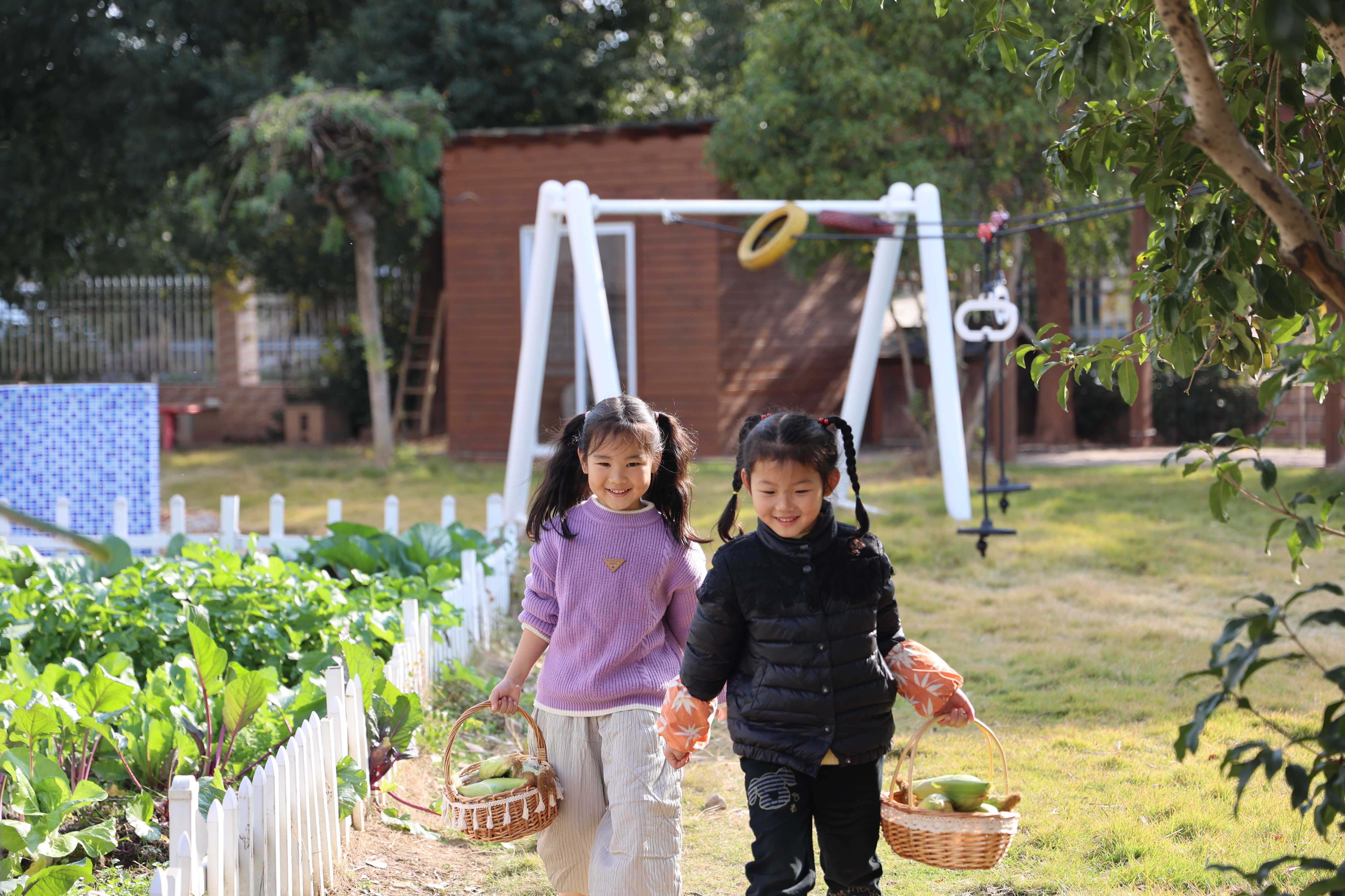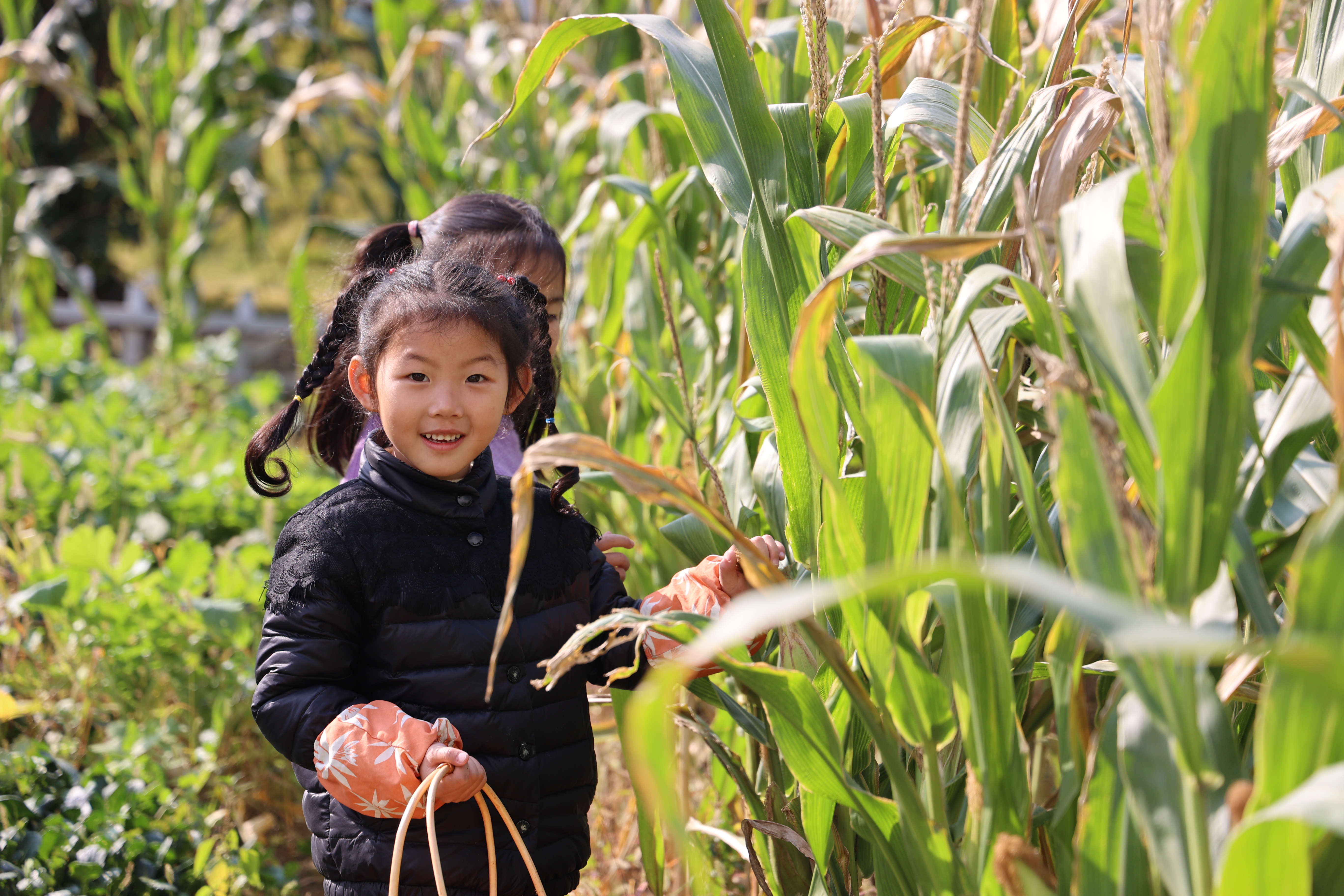 孩子们前往菜园地采摘玉米,并进行蔬菜种植。