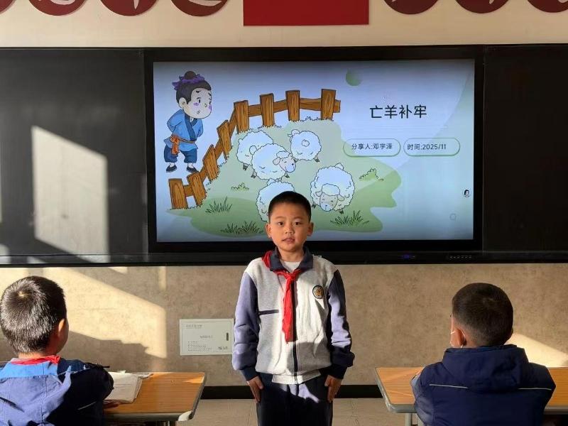 结合自己对《小鲤鱼跳龙门》故事的感悟,二年级一班杨卓禹同学分享说:“小鲤鱼们为了梦想勇敢前行、互帮互助的精神,让我明白,只要坚持努力,就能渡过难关、实现梦想。”结合从《亡羊补牢》中获得的启示,二年级五班王思哲同学说:“犯错并不可怕,及时补救就能避免更大的损失。”孩子们用画笔定格故事瞬间,用文字记录心灵感悟,让每一张卡片都承载着童真与思考。