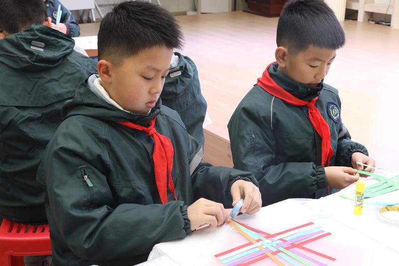 除了美食制作,师乐乐老师的《纸艺编织大世界》带来了不一样的精彩。寻常纸条在孩子们指尖穿梭,经纬交织间勾勒出万千天地。编织过程中,孩子们感悟到坚持、合作与敢于尝试的劳动精神,红色基因也悄然融入童年记忆,让劳动教育实现技能培养与文化传承的有机统一。