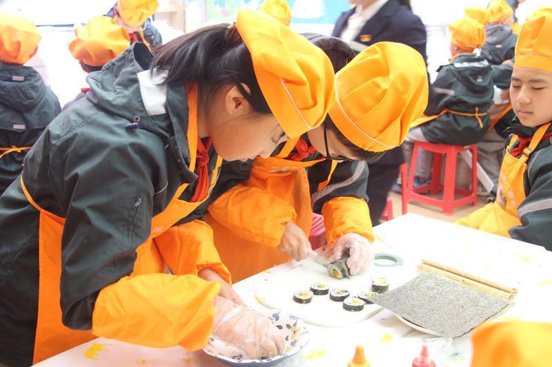 同学们学习制作紫菜包饭,了解美食背后的文化内涵。