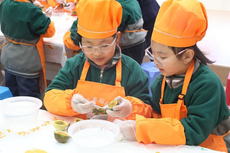 同学们在劳动课堂上学习制作百香果蜂蜜柠檬水。