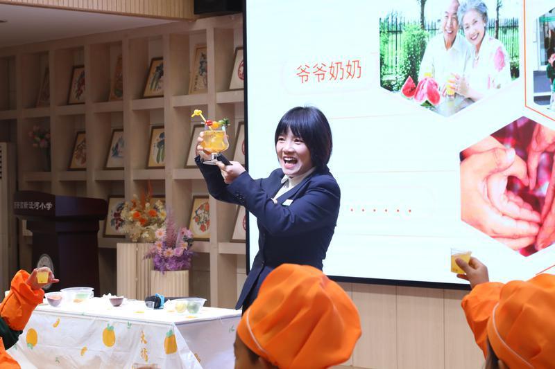 活动中,四节特色满满的劳动课轮番登场,让孩子们在“做中学、学中思”。窦瑶老师的《百香蜂蜜柠檬水》课堂上,孩子们化身“清洁小卫士”“宝藏挖掘师”,在安全指引下合作完成食材处理、分层装盒、腌制冲调等环节。从认识“水果精灵”的营养功效,到亲手搭建“暖心塔”,再到争当“首席品尝官”,酸甜的饮品里藏着劳动的乐趣,让孩子们在动手中学会了珍惜食材、懂得了合作。