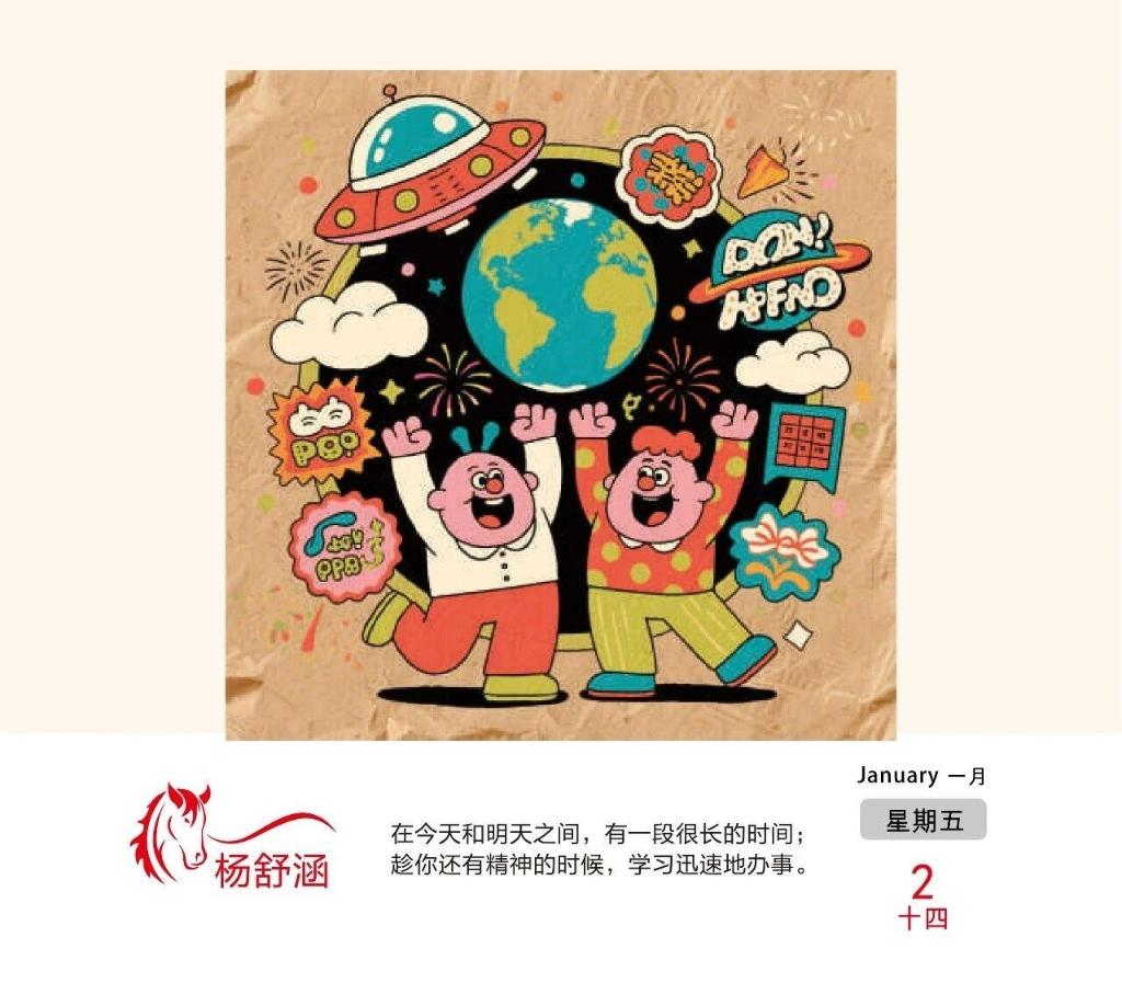 “不攀比、不抱怨、不计较,多包容、多理解、多付出,因为有一种努力叫做靠自己”翻开日历一月开篇,孙羽馨同学的寄语配上灵动的插画,瞬间拉满奋斗氛围。而杨舒涵写下的,“在今天和明天之间,有一段很长的时间;趁你还有精神的时候,学习迅速地办事。”更是戳中了无数人的共鸣。从“你改变不了环境,但你可以改变自己”的清醒,到“当你能飞的时候就不要放弃飞”的热血,365页日历里,每一句都是高新二中学子的心声独白,每一幅插画都出自师生创意构思。