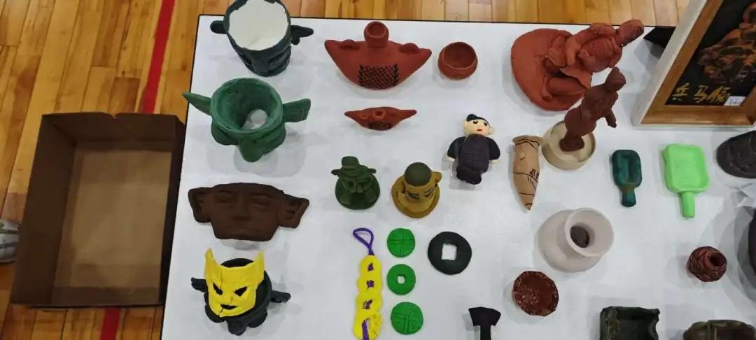 黏土也在学生掌心被赋予新生。一块块普通的彩泥,经过学生揉、捏、搓、压等手工制作,变身成一件件迷你作品。从造型粗犷的原始骨耜,到纹饰精美的商代青铜器,再到线条流畅的汉代陶俑。学生们对照史料,细心复刻文物的形制与纹路,用双手与千年历史对话,亲手丈量文明的厚度。