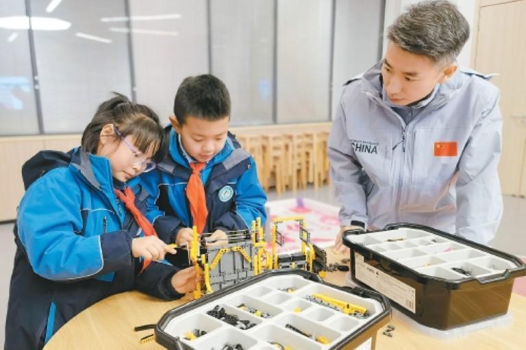 “宇航天地”教室里,孩子们在老师的指导