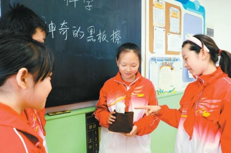 景诗茜(中)向同学们介绍自己制作的“自动负压吸尘黑板擦”