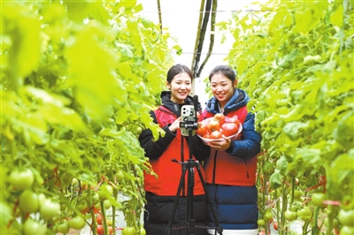 1月29日,在山东省滨州市博兴县店子镇辛朱村,返乡大学生志愿者在大棚里帮助农民网络直播推销西红柿。 陈彬 摄