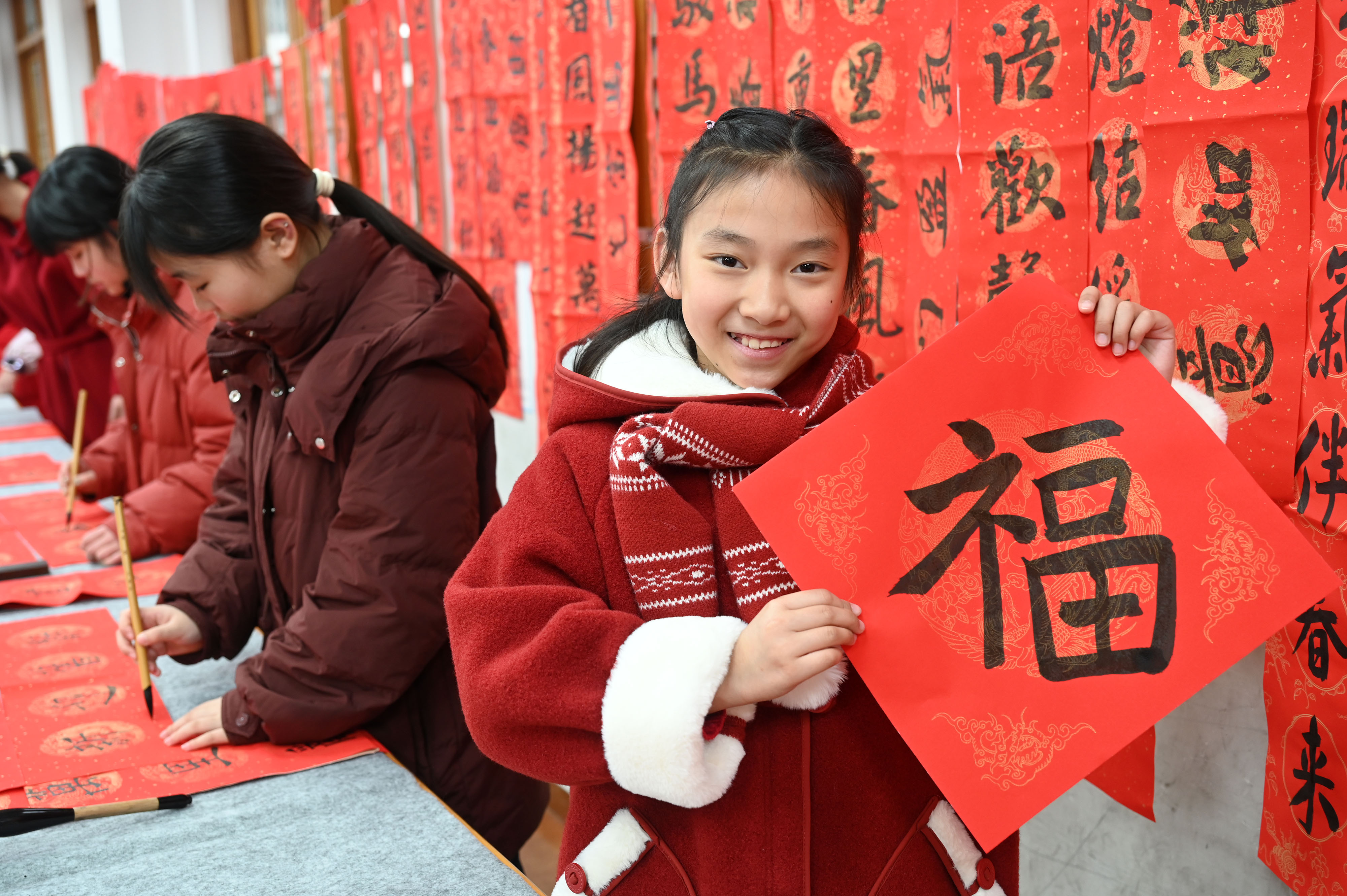 春节临近,四川省内江市东兴区文化馆开展“小手写春联 墨香送祝福”志愿服务活动,组织有书法特长的小学生为社区居民义务书写春联和“福”字,用墨香送上新春祝福。