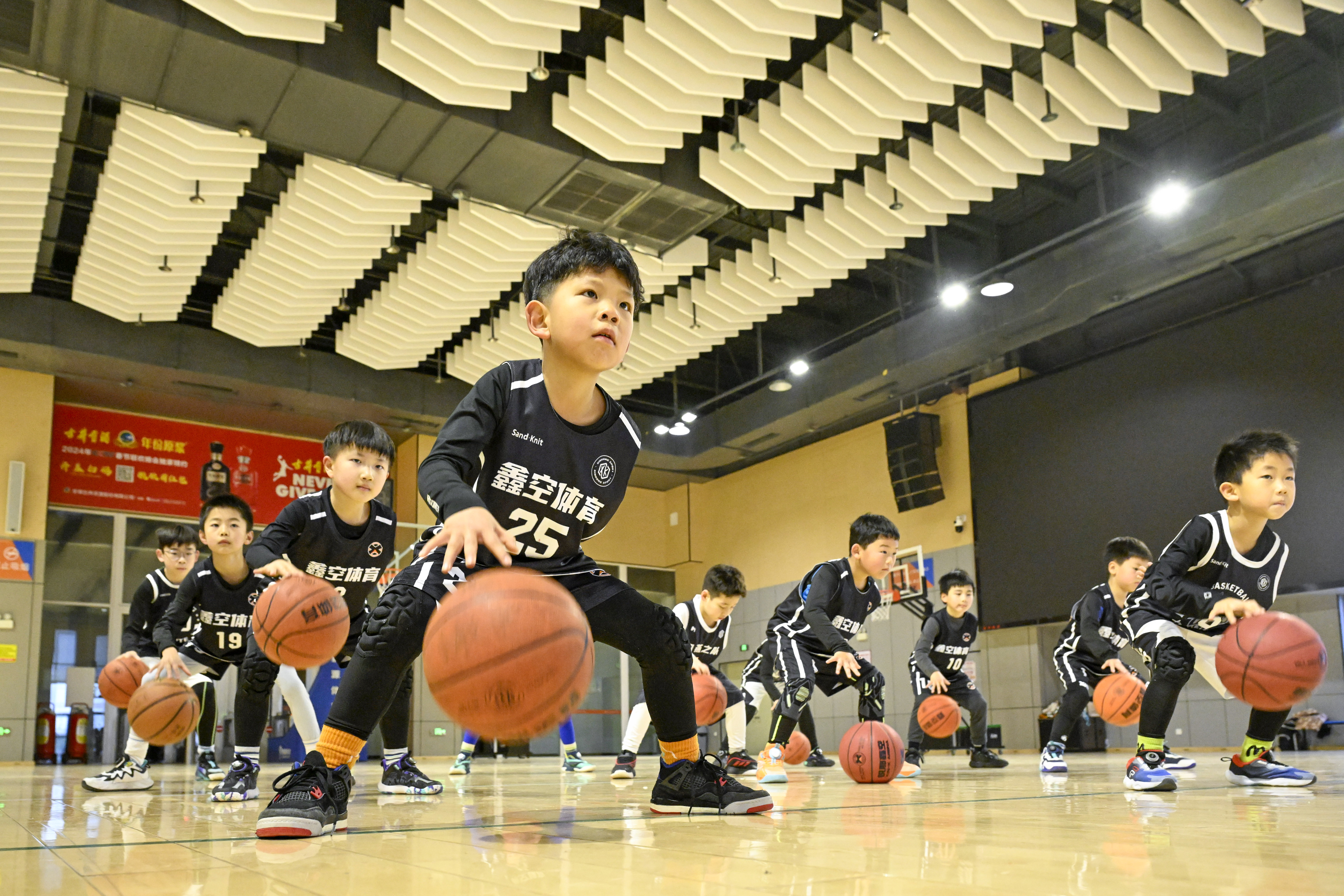 2月3日,在安徽省合肥市庐阳区全民健身体育中心,小朋友们正在多彩兴趣班学习篮球技能。赵明 摄