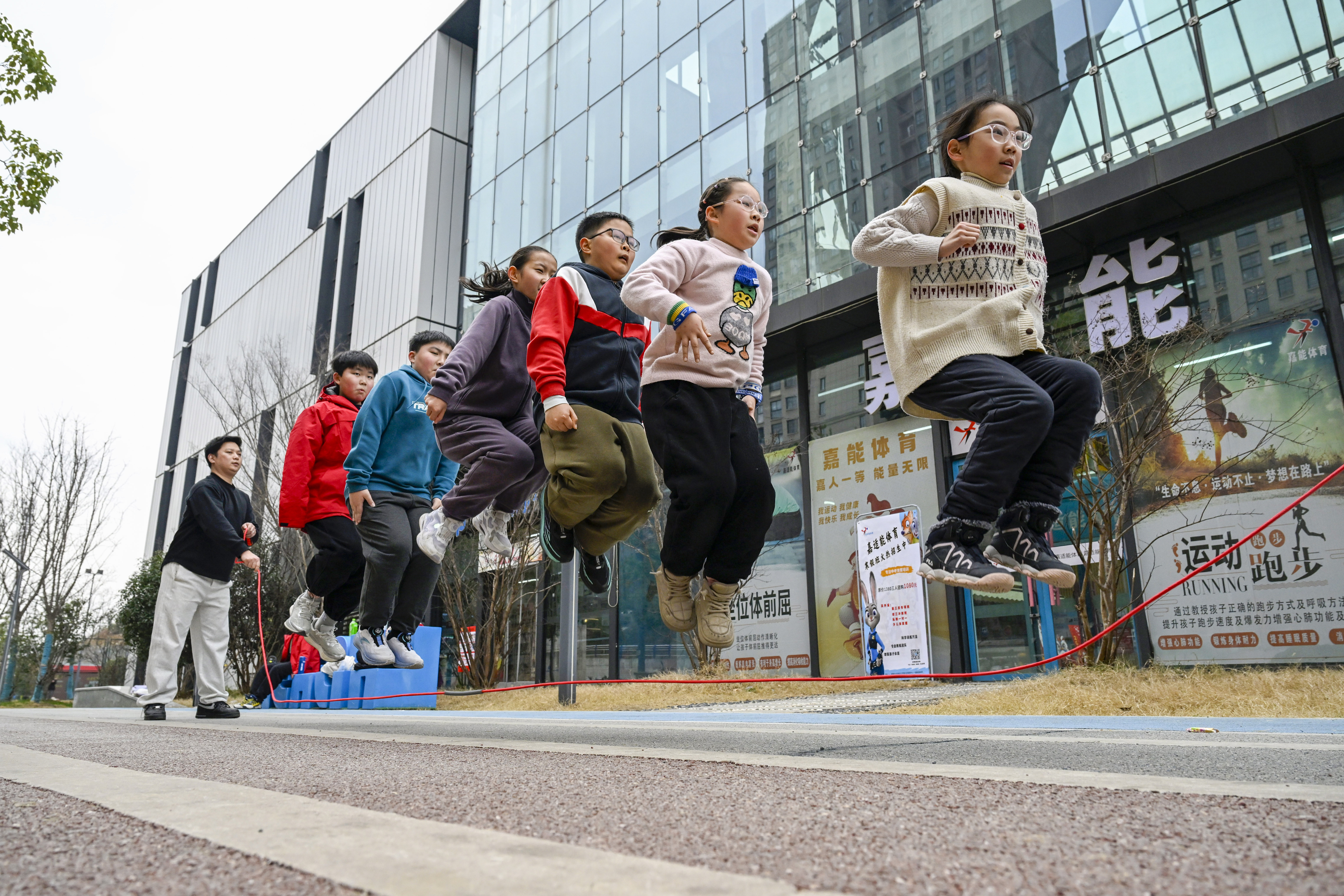 2月3日,在安徽省合肥市庐阳区全民健身体育中心,小朋友们正在多彩兴趣班集体跳绳。赵明 摄