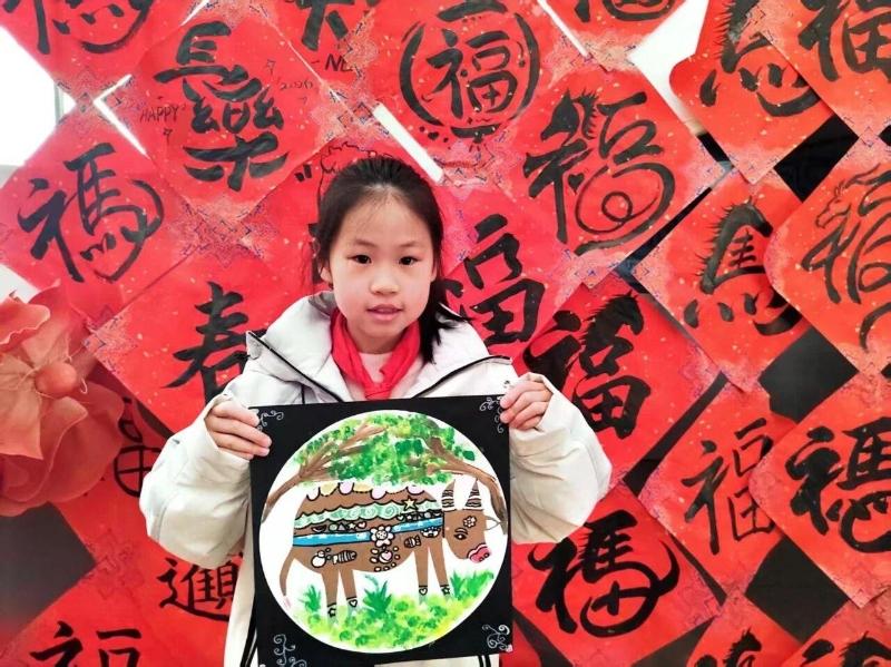 立春的色彩,藏在孩子们的指尖与巧思里。孩子们用环保材料拓印新芽、制作柳絮,在红纸上剪出春牛与春字。郝若熙的春牛剪纸饱含年俗暖意,刘雯歆的圆盘画中,春牛身披花朵与星星彩衣漫步绿草地,每一件作品都是孩子们与春天的温柔对话,将节气之美融入指尖创作。