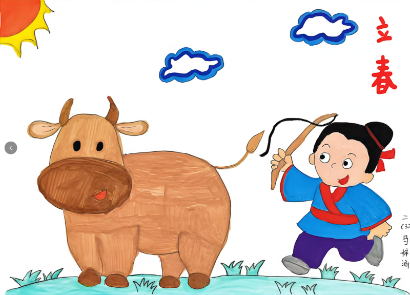 闫杨夕创作现代版《春牛图》,暖阳下的春牛、牧童与抽芽树木构成生机画卷,寓意播撒快乐与希望;孙蔚桐和妈妈一起做了“立春三鲜卷”,“用春饼卷上豆芽、韭菜和鸡蛋,一口咬下去,满满都是春天的味道!我给这道菜取名‘春风一口鲜’。”马梓涵则将高鼎诗句“草长莺飞二月天,拂堤杨柳醉春烟”改编为朋友圈文案:“小草偷偷冒头啦,小鸟也出来唱歌,春天真热闹”,用童真视角诠释经典。