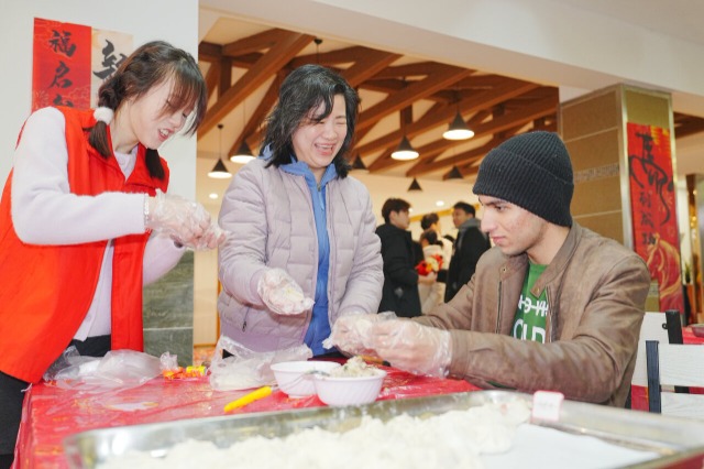 西南大学新春团拜会现场,外国留校学生在学习包饺子。