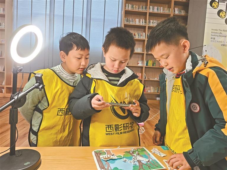 2月10日,在西影电影园区,孩子们化身“小小电影人”,进行平面定格动画创作。