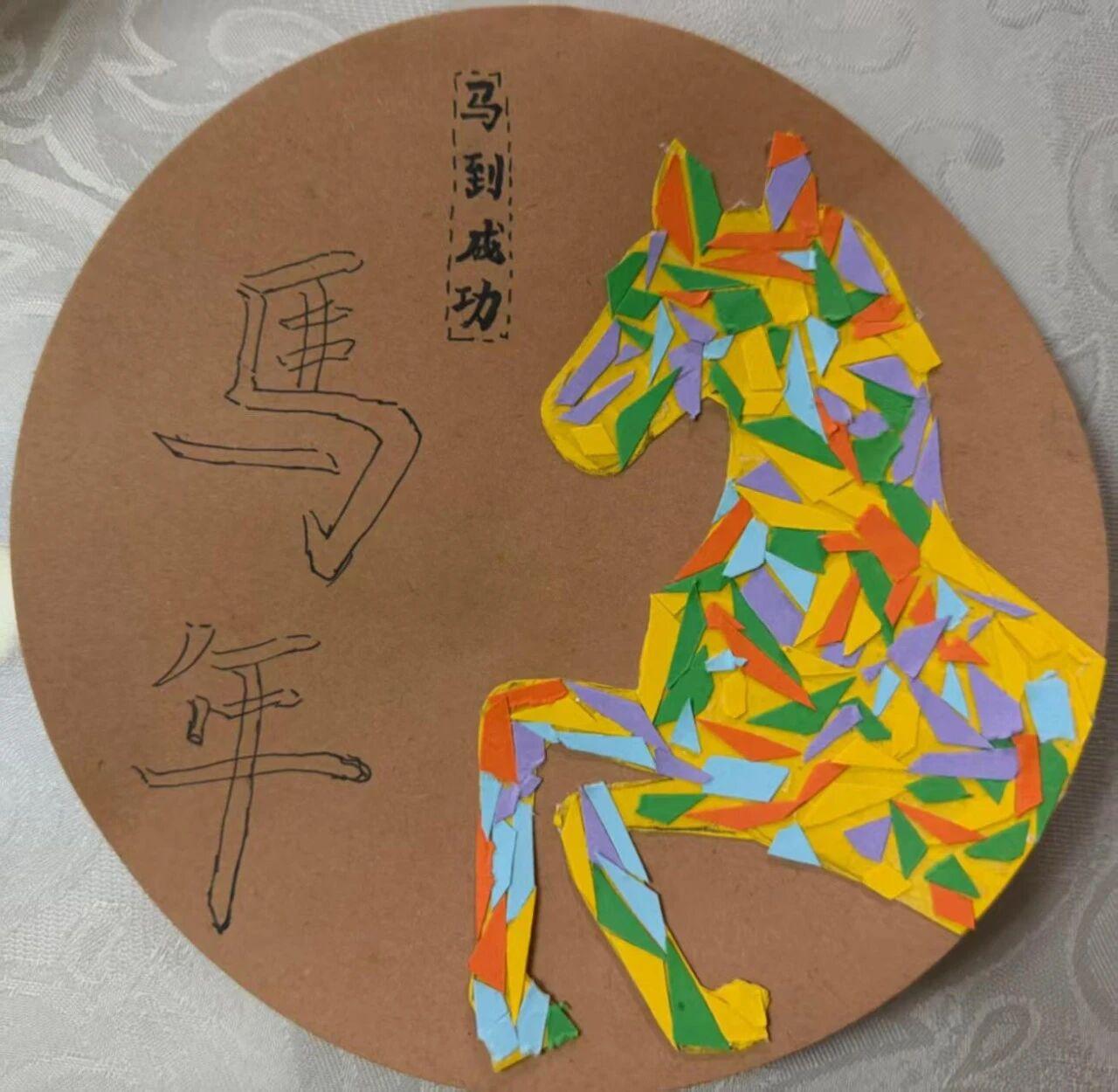 此次实践活动根据学生年龄段特点设计不同创作形式,低年级学生化身 “手工小匠人”,解锁彩纸、毛线、黏土等多种材料的创意玩法,将天马行空的想象融入制作,一只只憨态可掬的手工小马跃然眼前,萌趣的作品里藏满童真与年味;高年级学生则开启 “马年贴贴乐” 拼贴创作之旅,以拼贴为 “画笔”,用细腻的构思、丰富的色彩诠释对马年的独特理解,每一块拼贴、每一笔装饰都尽显扎实的美术功底,也饱含着对新年的真挚祝福。