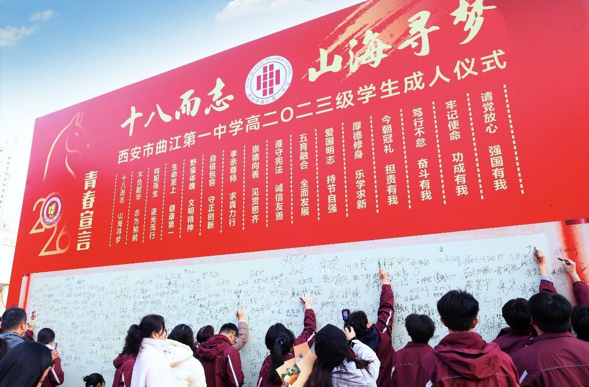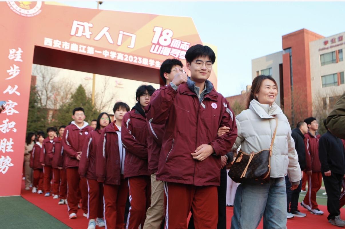 日前,西安市曲江第一中学操场暖意融融、青春激荡,以“十八而志,山海寻梦”为主题的高2023级成人仪式隆重举行。全体师生与家长齐聚一堂,共同见证高三学子迈入十八岁成人殿堂,为冲刺高考凝聚力量、吹响号角。