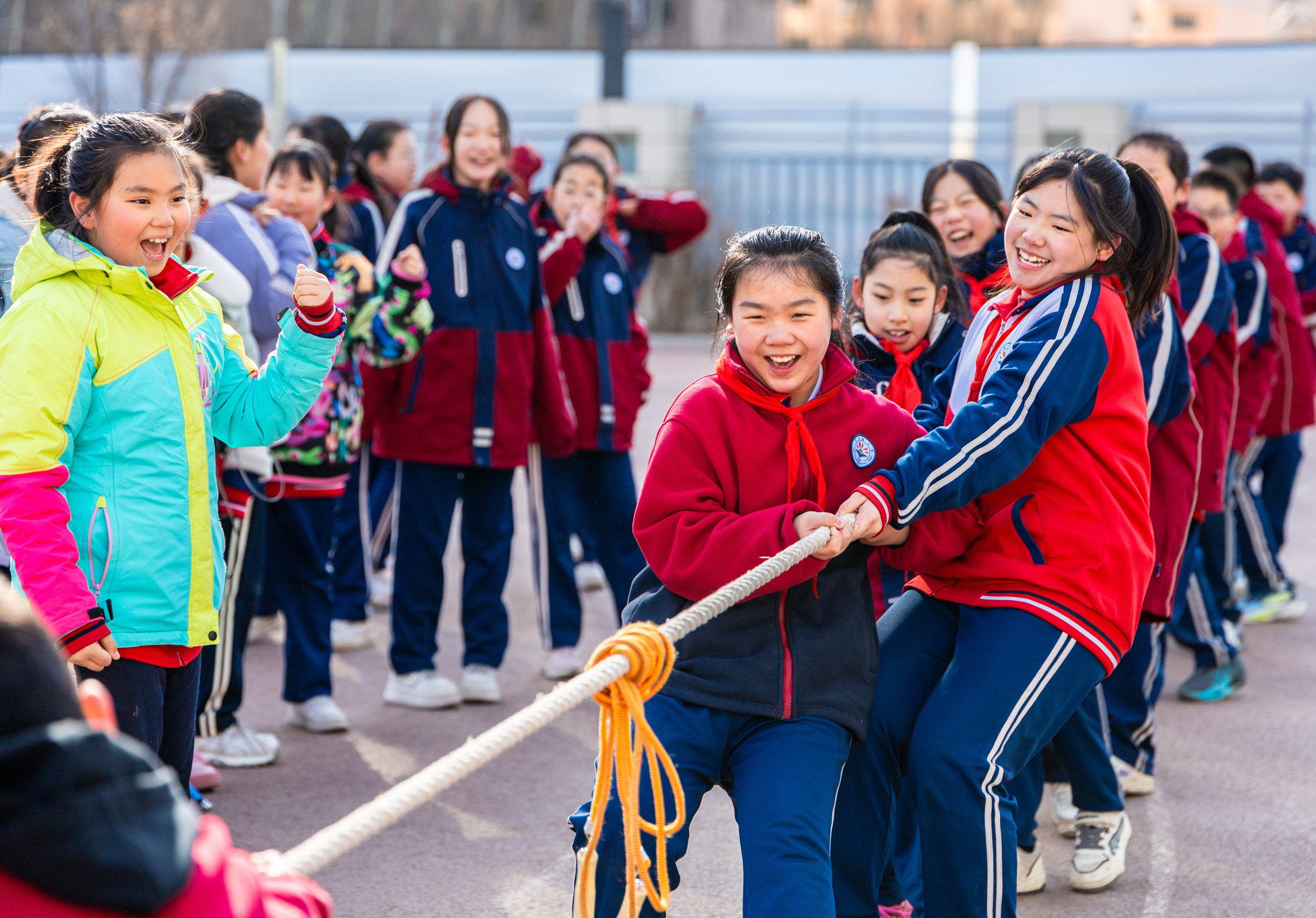 内蒙古呼和浩特市玉泉区石东路小学学生在操场参加拔河趣味赛。通讯员 丁根厚 摄