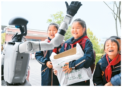 近日,重庆市两江新区重光小学迎来春季开学,智能机器人走进校园与学生们互动。王加喜摄(人民视觉)