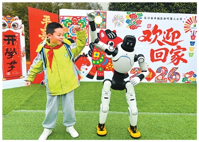 近日,湖南省长沙市开福区新竹第二小学以“AI科技+教育”的方式迎来春季开学,智能机器人走进校园,与学生面对面互动。郭立亮摄(人民视觉)