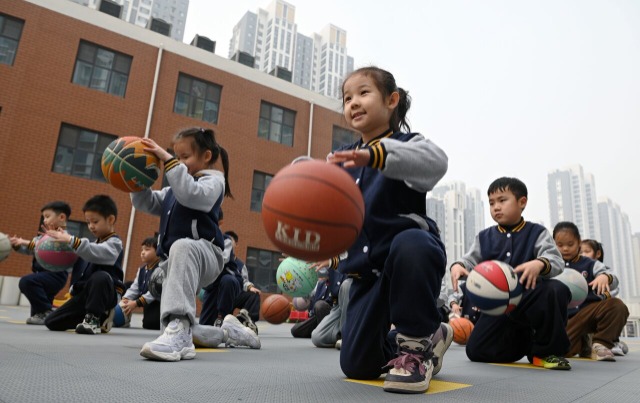 小朋友们在练习篮球操动作。通讯员 周绍宗 摄