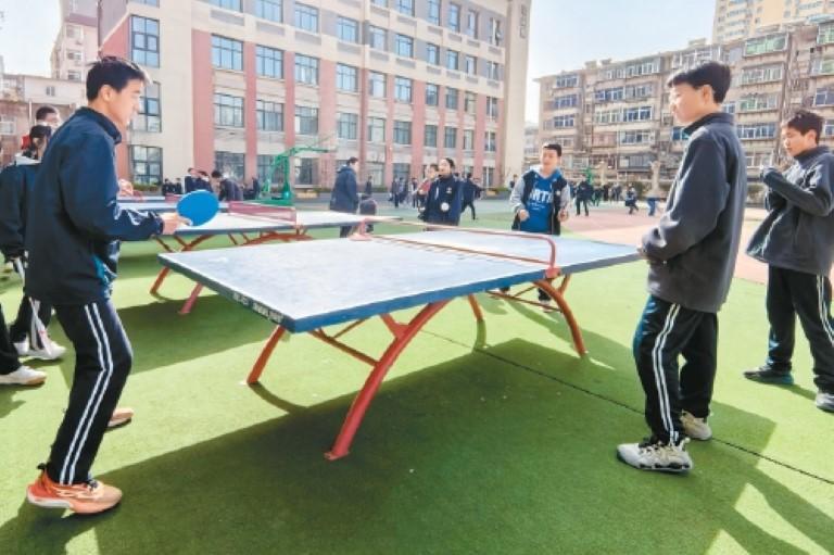 在西安市星光实验学校,早到的初中生在操场上打乒乓球。(记者 王燕 通讯员 王媛媛 摄)