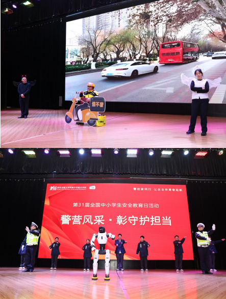 安全知识变得生动易懂。其中,原创情景小品《天使与恶魔》以沉浸式表演让交航学子直观感受危险隐患,切实提升学生自我防护能力,而现场亮相的智元机器人更是亮点十足,通过模拟交警交通指挥动作,将前沿科技与安全教育深度融合,实现寓教于乐,充分激发了学生的学习积极性。整场活动形式新颖、内容丰富,让在场师生全面掌握安全防护技能,深刻领悟文明出行、遵守规则的重要意义。