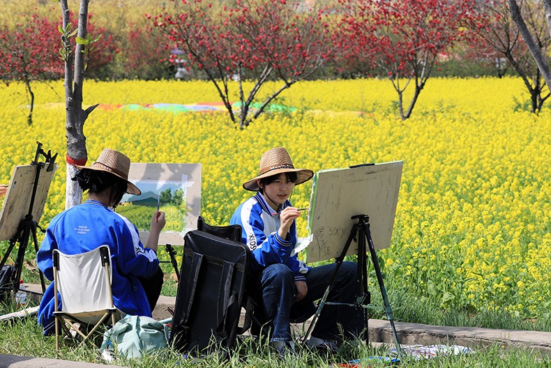 4月3日,河南省许昌市襄城县第三高级中学学生在湛北镇首山千亩油菜花田间写生。新华社发