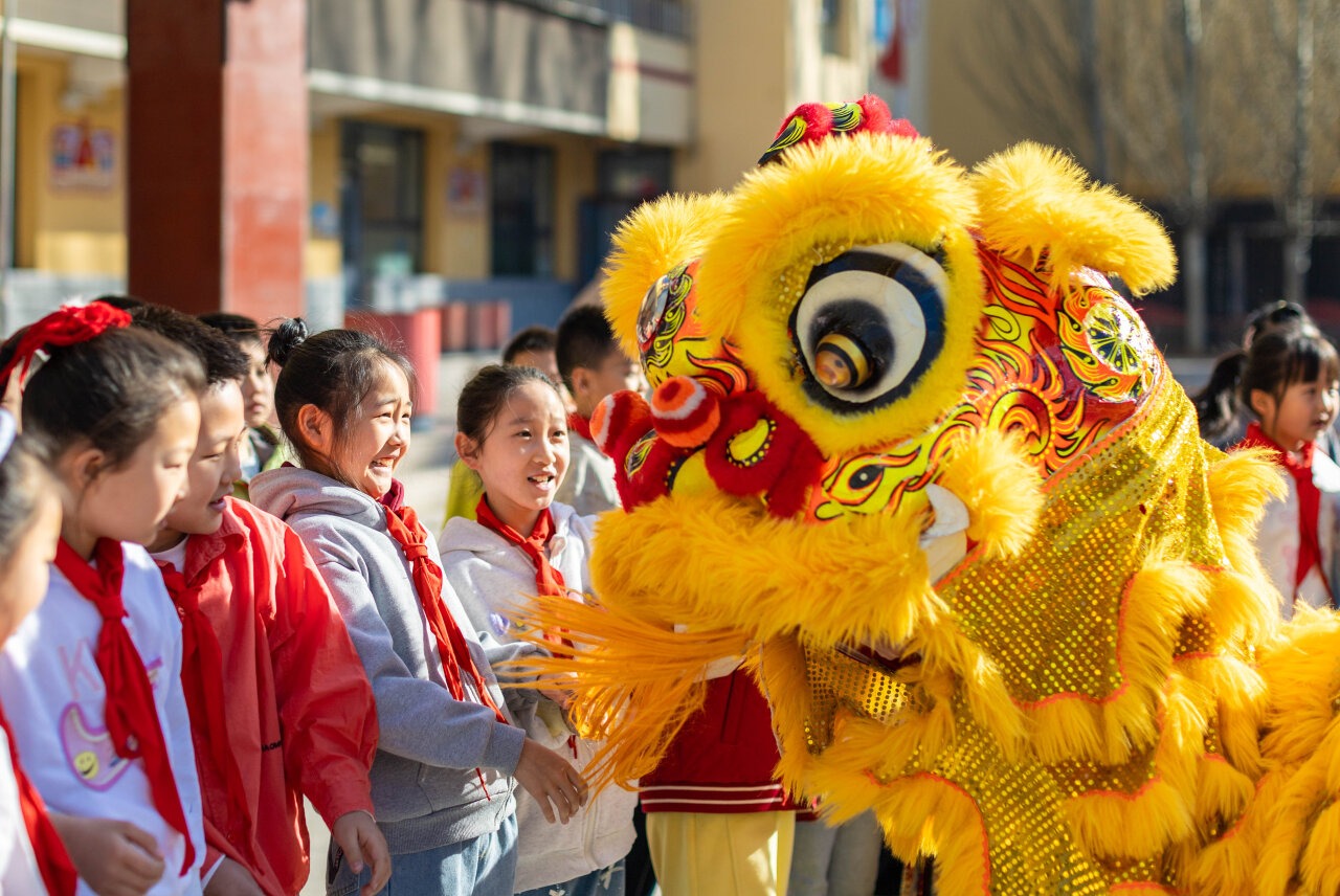 4月2日,内蒙古呼和浩特市玉泉区清泉街小学清明节主题活动现场,参与舞狮表演的学生与同学们互动。