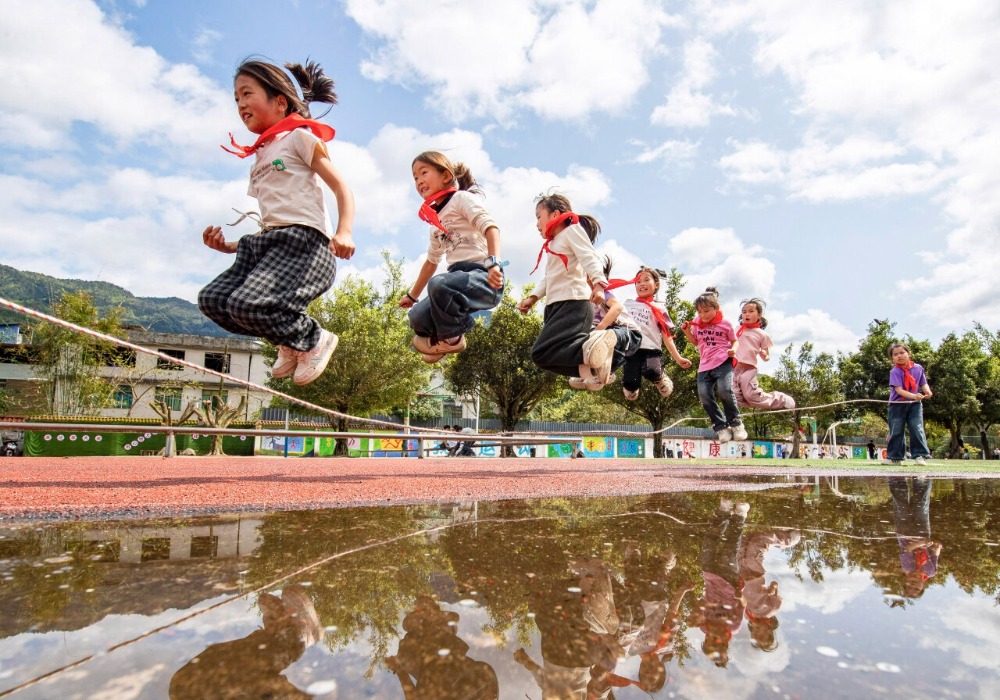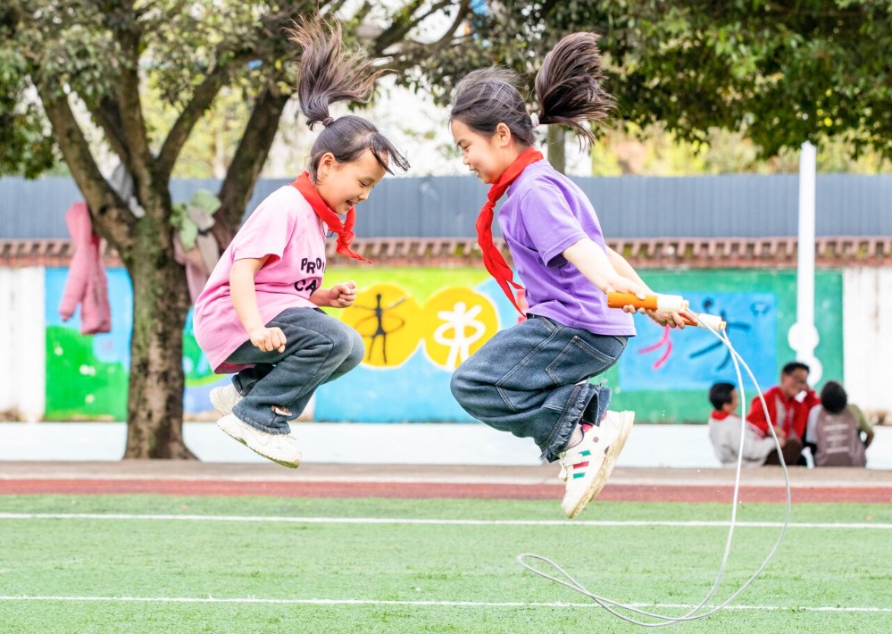 贵州省从江县刚边壮族乡中心小学学生在课间参加跳绳运动。通讯员 罗京来 摄