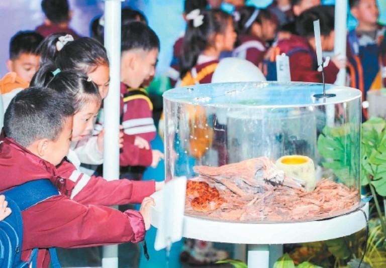 在科学探究展厅里,一群小学生围在一台物理装置前,七嘴八舌地讨论着,时不时爆发出“哇”的惊叹;在硬核力量展厅内,一辆被拆解的新能源汽车备受关注,几名初中生围在透明防护罩前,仔细研究电池组的构造;在秦岭昆虫博物馆,上百种活体昆虫在生态场景中自在生活,有助于孩子们更好地了解生物多样性……