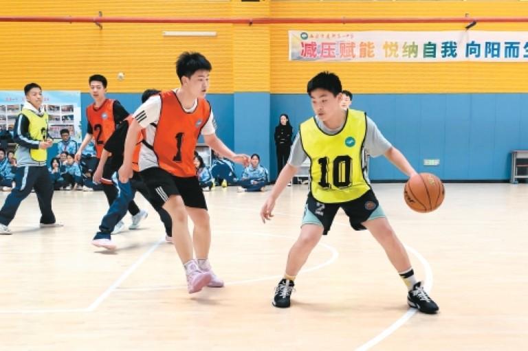 “太刺激了!每次上场都特别激动。”刚刚结束比赛的初二学生魏子恒擦着汗,眼中闪烁着兴奋的光芒。去年,他和队友们拿下了二等奖,今年他们的目标更明确——冲击一等奖。为了备战,魏子恒和伙伴们利用寒假、大课间等空闲时间进行加练。“篮球让我交到了很多朋友,打完球身心舒畅,很放松。”他笑着说。