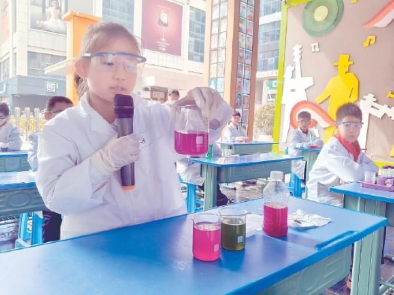 “这个是药箱里的碘伏,这个是维生素C,你知道它们两个放在一起会发生什么奇妙的变化吗?我今天带来的科学小实验是‘消失的颜色’……”在决赛现场,未央路小学一年级(3)班的张茗越同学一边做着实验,一边自信满满地向记者介绍了他的实验原理。
