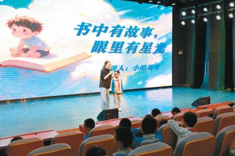 在西安高新第九小学的礼堂里,小酷哥哥用夸张的肢体动作、幽默的语言和惟妙惟肖的角色切换,让纸页上的童话角色“活”了过来。他时而变成爱打喷嚏的怪兽,时而变成爱打呼噜的小怪兽,孩子们在欢声笑语中,不知不觉走进了充满想象力的童话世界。