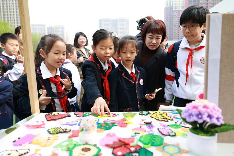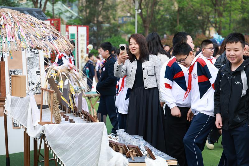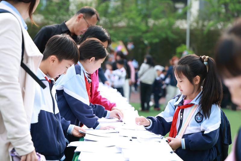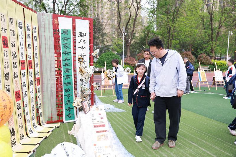 “春风拂过操场,暖阳洒满校园,这场艺术展是一场童心与艺术的春日之约。”二年级十二班谢翊宸的家长也分享了观展感受。漫步展区间,水墨氤氲的国画、晕染自然的扎染、色彩浓烈的油画、工整娟秀的书写作业、精巧的非遗手作等,都让她忍不住为孩子们的创造力和学校的用心点赞。她认为,学校以画笔为媒、以童心为墨,为孩子们搭建了自由生长的艺术天地,让传统文化与创意想象在校园里生根发芽,让每个孩子都能在艺术里找到自己的光芒。